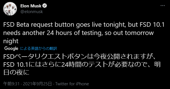 アメリカでは順次、解禁されてきているテスラの自動運転「FSD」(フル・セルフ・ドライビング)。2021年9月25日のイーロン・マスクのTwitterより優良なドライバーに限って、FSDのリリースを行うと発表がありました。