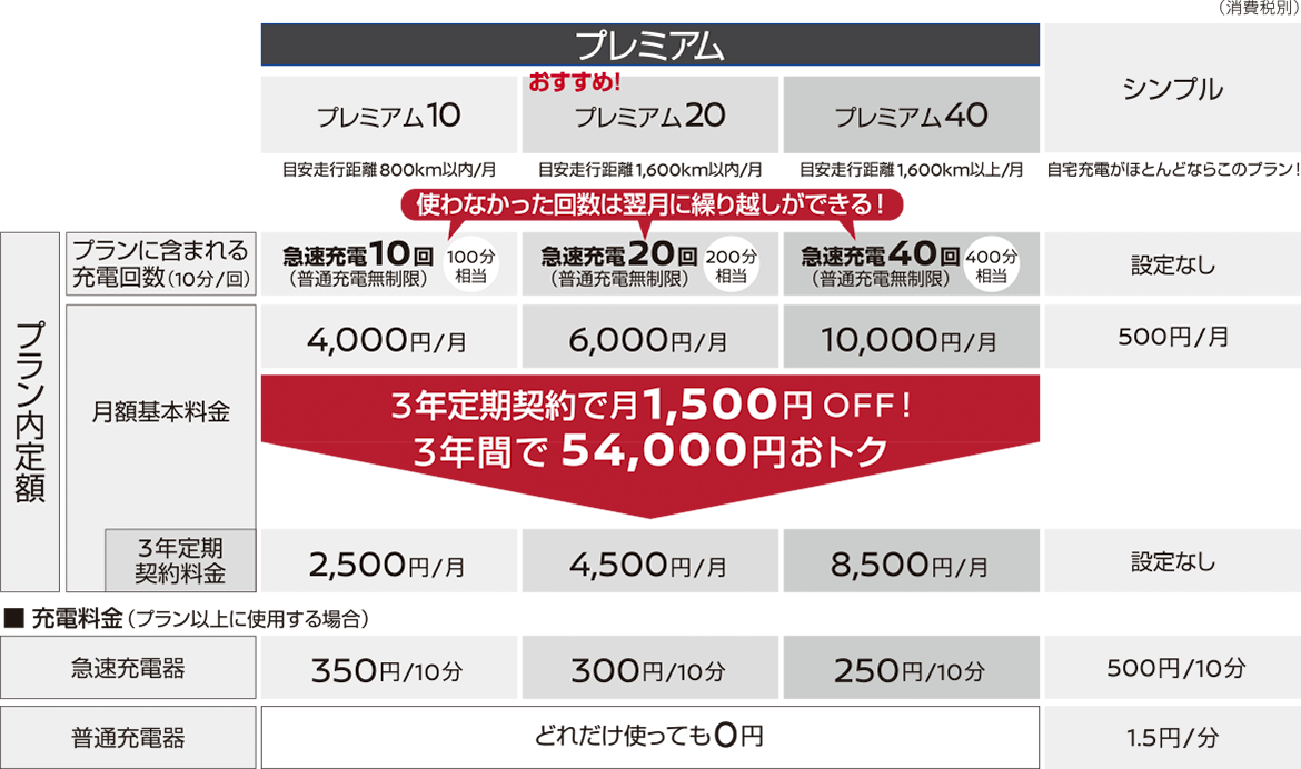 プレミアムの3プランでは急速充電の無料分が付帯されています。使わなかった回数(1回:10分カウント)は翌月に繰り越しができ、普通充電は使い放題です。ただ結論的には、金額はハイブリッドカーと同じぐらいのランニングコストになってきます。