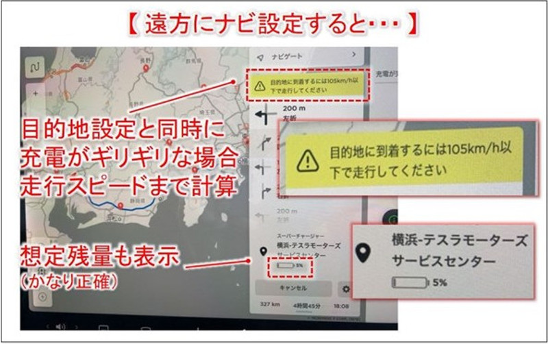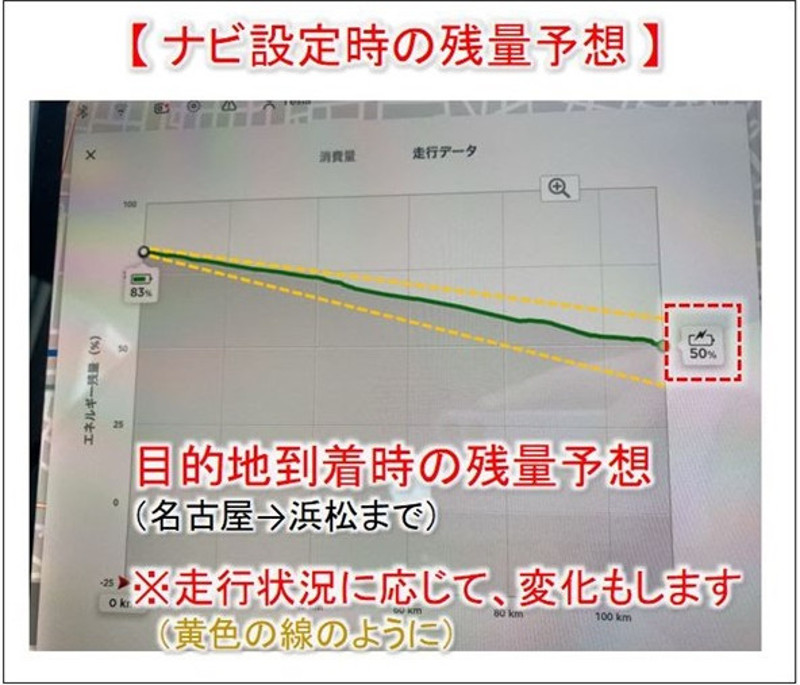 テスラでは、ナビ設定すると目的地到着時点の残量を予め表示してくれます。