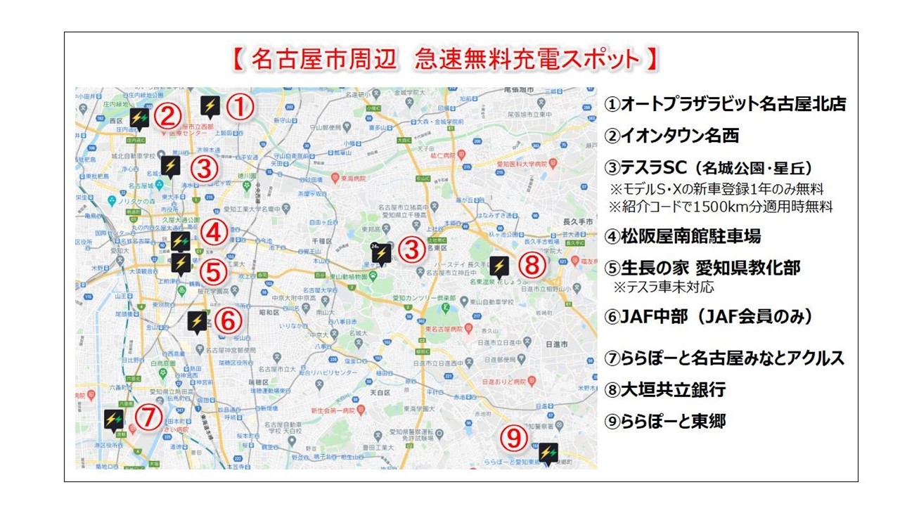 名古屋市・春日井市・小牧市・一宮市などの名古屋~尾張地方では恐らく付近に充電スポットがありますので、念のために書きましたがココは問題ない方がほとんどでしょう。