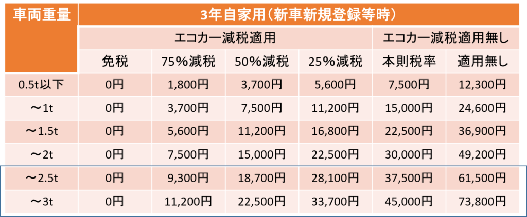 上記のように、エコカー減税が効く車両であっても、3t以下の25%適用車両で33,700円×5年=168,500円分の税金が、EVの場合は不要です。